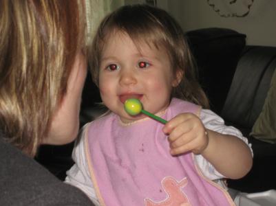 Heute nach dem Kindergarten war ich mit Mama beim Augenarzt. Der hat geguckt, ob meine Augen gesund sind und ob ich alles richtig sehen kann. Mit einem Licht hat er mir in die Augen geleuchtet und ich bin ganz ruhig sitzen geblieben auf Mamas Schoß. Als er fertig war, habe ich von Mama einen Lolli bekommen, weil ich so tapfer war. Über den Lolli habe ich mich ungefähr so gefreut, wie bei dem Lolli auf dem Bild hier...